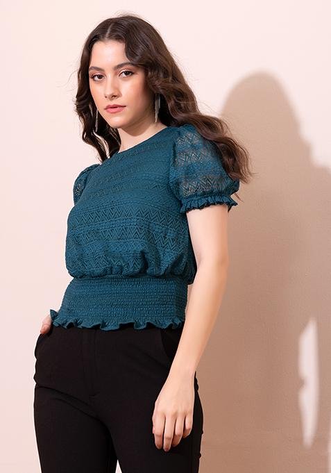 Description Colour: Teal Blue Material: Lace Neck: Round Sleeve: Short Closure: Button